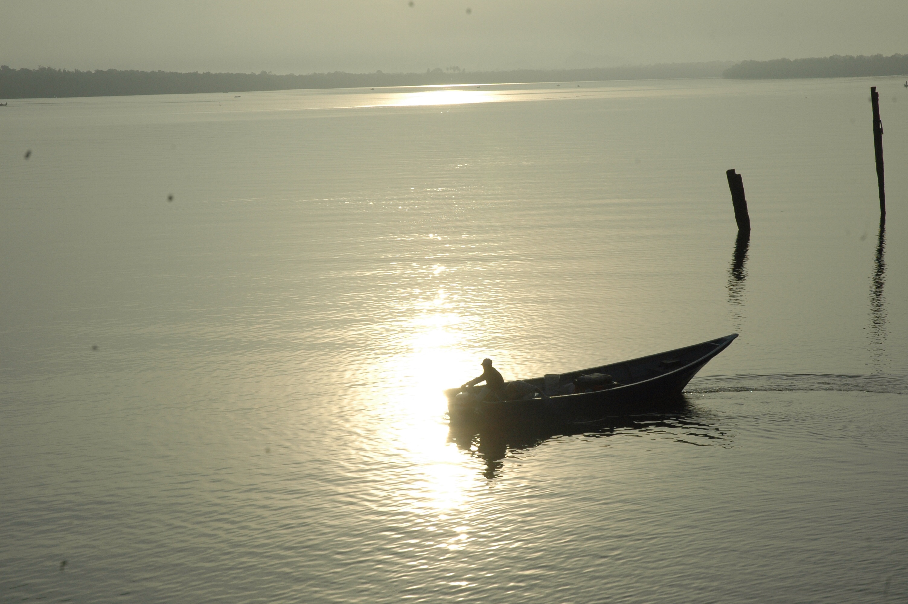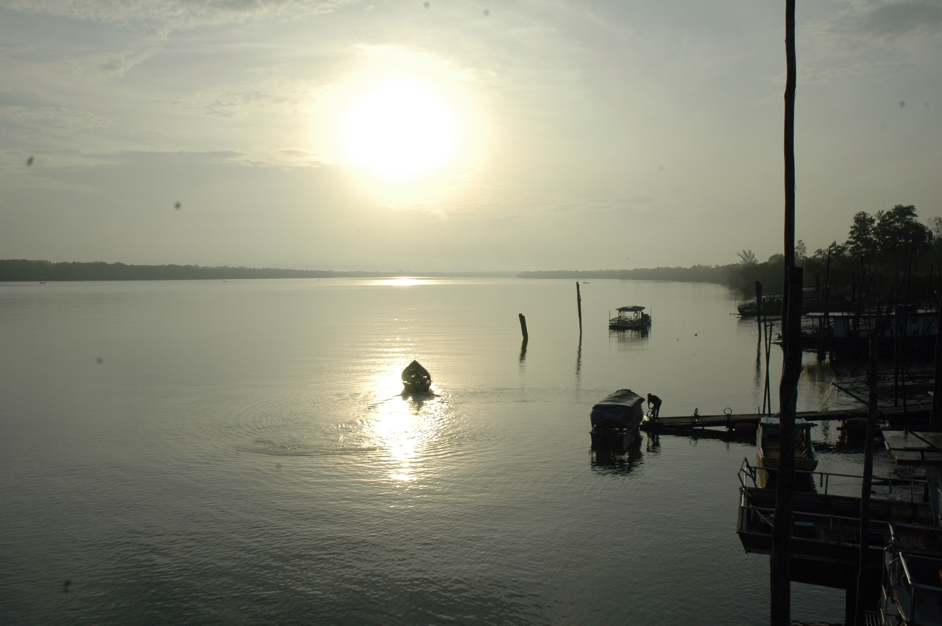 Livet med fiskene begynder tidligt om morgenen, og jeg er nede ved flodbredden med kameraet, så snart det bliver lyst. Ved halv syv tiden. Sjældent har jeg oplevet så smuk en morgen med den let slørede dis over floden og solen, der er på vej op over mangroveskoen for at gøre endnu en dag brændende hed. Med bådmotoren over skulderen er fiskerne på vej til deres både. En bådejer har været tidligt oppe og kommer nu tøffende over det stille vand fra flodbredden over for. Taget på hans lille båd består af gamle plastikstykker, der kan give ly for de voldsomme regnskyl. Han lægger til ved en af de på høje pæle byggede broer, og en dreng med et tornyster på ryggen hopper i land. Efter en uges ferie begynder skolen igen i dag.