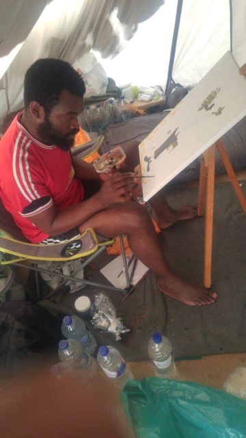 Da Afanwi blev evakueret væk fra vinterkulden i flygtningelejren på Chios og flyttet til turisthotellet ved den græske kystby, var han stadig bange for, at UNHCR skulle opdage, at han malede. Så han fortsatte med at male i skjul på sit hotelværelse.